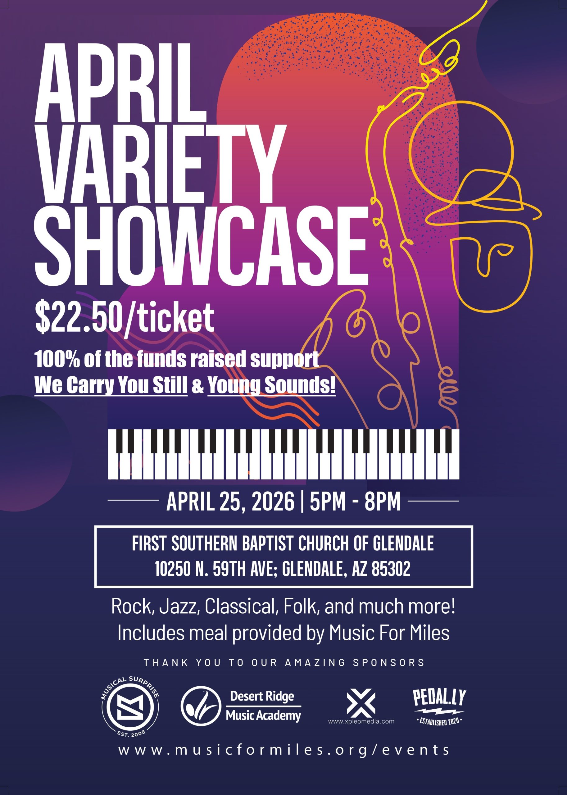 Join us for a catered variety show featuring an inspiring mix of musical styles—from jazz to solo piano—for an unforgettable evening of talent, generosity, and community. This special event benefits We Carry You Still and Young Sounds of Arizona.